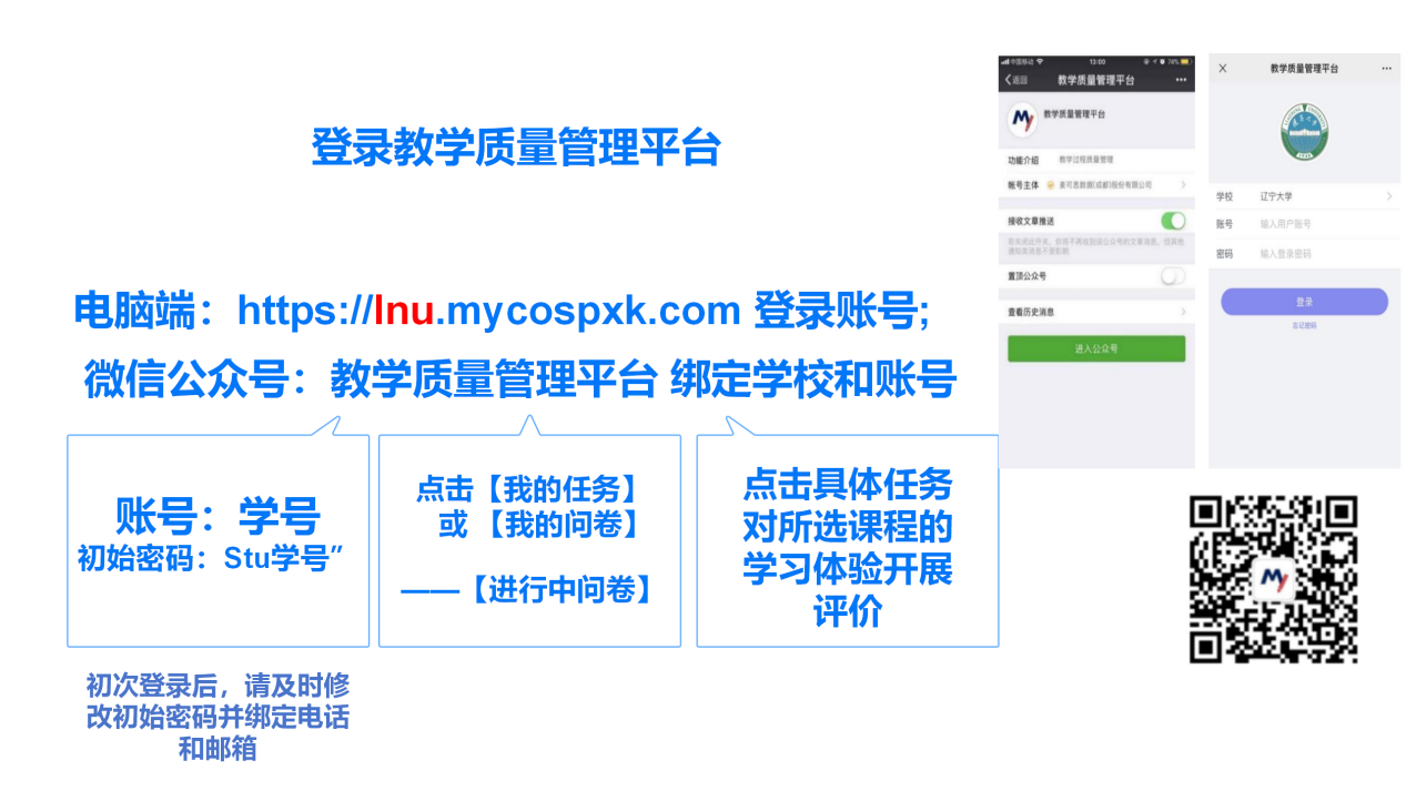 1.学生可通过计算机登录辽宁大学教学质量管理平台(https://lnu.mycospxk.com)或通过微信公众号“教学质量管理平台”进行“期中学习体验调查”问卷填写。